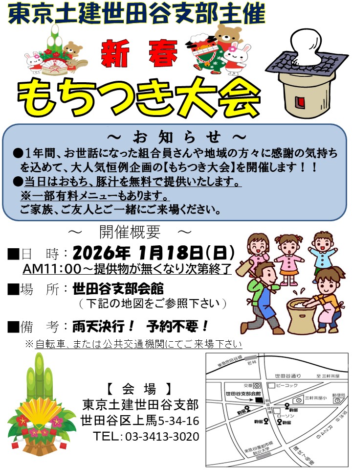 1月18日(日)11時より、世田谷支部会館にてもちつき大会を開催いたします。提供品が無くなり次第終了[